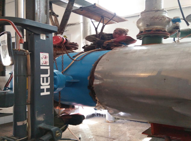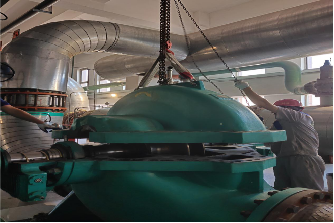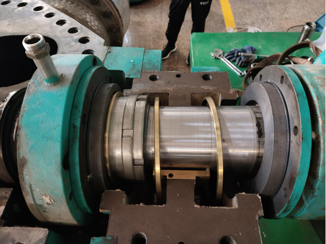 1#循環(huán)泵可以說是隔壓站之重器,2016年安裝投入使用,已連續(xù)穩(wěn)定運(yùn)行3個(gè)采暖季。額定流量5000T/H,工作揚(yáng)程80米,非嚴(yán)寒期單臺(tái)泵運(yùn)行就可以滿足1000萬㎡的供熱任務(wù)。因連續(xù)工作水泵機(jī)械密封磨損老化出現(xiàn)漏水,2020年隔壓站將1#循環(huán)泵的維修列為重點(diǎn)檢修工程。8月31日,邀請(qǐng)水泵維修專業(yè)技術(shù)人員到場(chǎng)在隔壓站機(jī)修人員的配合下對(duì)水泵進(jìn)行維修。