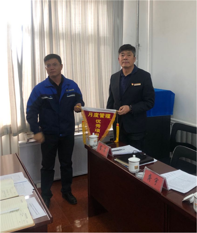 城建公司副總經(jīng)理胡競陽為第三名頒發(fā)《月度管理優(yōu)秀項目部》榮譽稱號(圖右城建公司副總經(jīng)理崔濤;圖右項目經(jīng)理崔成志)