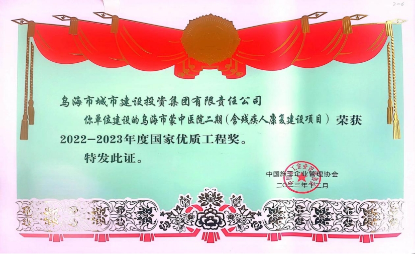 烏海市城市建設(shè)投資集團(tuán)集團(tuán)有限責(zé)任公司烏海市蒙中醫(yī)院二期(含殘疾人康復(fù)建設(shè)項(xiàng)目)榮獲“國(guó)家優(yōu)質(zhì)工程獎(jiǎng)”