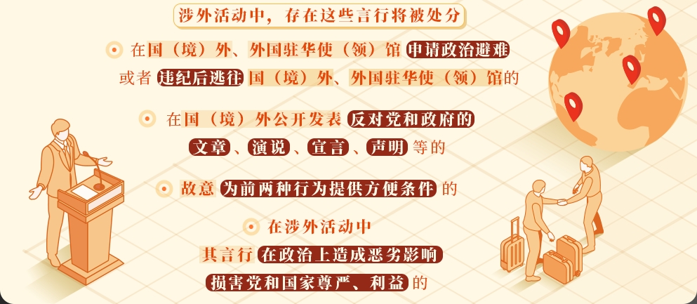 涉外活動關(guān)系黨和國家的尊嚴和榮譽,具有很強的政治性?!吨袊伯a(chǎn)黨紀律處分條例》第七十二條、七十三條對涉外活動中存在有政治問題的言行作了處分規(guī)定,主要有以下幾類:1.在國(境)外、外國駐華使(領(lǐng))館申請政治避難,或者違紀后逃往國(境)外、外國駐華使(領(lǐng))館的,給予開除黨籍處分。所謂“申請政治避難”,一般指黨員以所謂“政治原因”為借口,逃往國(境)外或外國駐華使(領(lǐng))館,申請取得居留權(quán)并居住在國(境)外或者外國駐華使(領(lǐng))館。“違紀后逃往國(境)外、外國駐華使(領(lǐng))館的”,一般指違紀黨員為逃避紀律處分,逃往國(境)外、外國駐華使(領(lǐng))館。無論是向外國申請政治避難,還是違紀后逃往國(境)外,都表明該黨員已徹底背叛黨的事業(yè),喪失了共產(chǎn)黨員條件,應(yīng)當給予開除黨籍處分。2.在國(境)外公開發(fā)表反對黨和政府的文章、演說、宣言、聲明等的,給予開除黨籍處分。黨員在國(境)外公開發(fā)表反對黨和政府的言論,同樣表明其已徹底背叛了黨的事業(yè),喪失了共產(chǎn)主義信仰和共產(chǎn)黨員應(yīng)具備的條件,應(yīng)當受到最嚴厲的紀律處分。3.故意為前兩種行為提供方便條件的,給予留黨察看或者開除黨籍處分?!疤峁┓奖銞l件”,主要指為申請政治避難、外逃或者在國(境)外公開發(fā)表反動言論等提供各種有利條件,如為其開具證明、代辦護照簽證、幫助購買車船機票、提供經(jīng)濟幫助、提供落腳點、提供發(fā)表反動言論的平臺,等等。4.在涉外活動中,其言行在政治上造成惡劣影響,損害黨和國家尊嚴、利益的,給予撤銷黨內(nèi)職務(wù)或者留黨察看處分;情節(jié)嚴重的,給予開除黨籍處分。此類違紀行為包括兩個條件:一是該行為發(fā)生在涉外活動中;二是在政治上造成惡劣影響,損害黨和國家尊嚴、利益。無論什么時候,黨員干部都要切實增強政治敏銳性,在涉外活動中以良好精神風貌和舉止言行維護黨和國家形象,堅決防范有政治問題的言行。