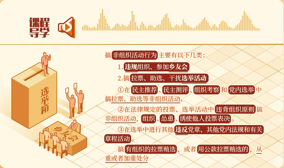 《中國共產(chǎn)黨紀(jì)律處分條例》第八十二條、第八十三條對(duì)搞非組織活動(dòng)行為列出負(fù)面清單,對(duì)違規(guī)組織、參加鄉(xiāng)友會(huì),以及搞拉票、助選、干擾選舉活動(dòng)作出處分規(guī)定。