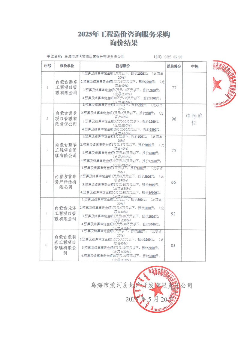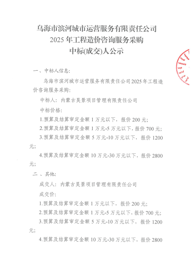 烏海市濱河城市運(yùn)營服務(wù)有限責(zé)任公司2025年工程造價咨詢服務(wù)采購中標(biāo)(成交)人公示