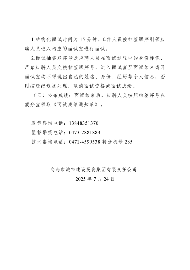 - 2025-07-27烏海市城市建設(shè)投資集團(tuán)有限責(zé)任公司五虎山井田南部采空區(qū)災(zāi)害綜合治理項(xiàng)目公開(kāi)招聘項(xiàng)目負(fù)責(zé)人考試面試成績(jī)查詢(xún)的通知